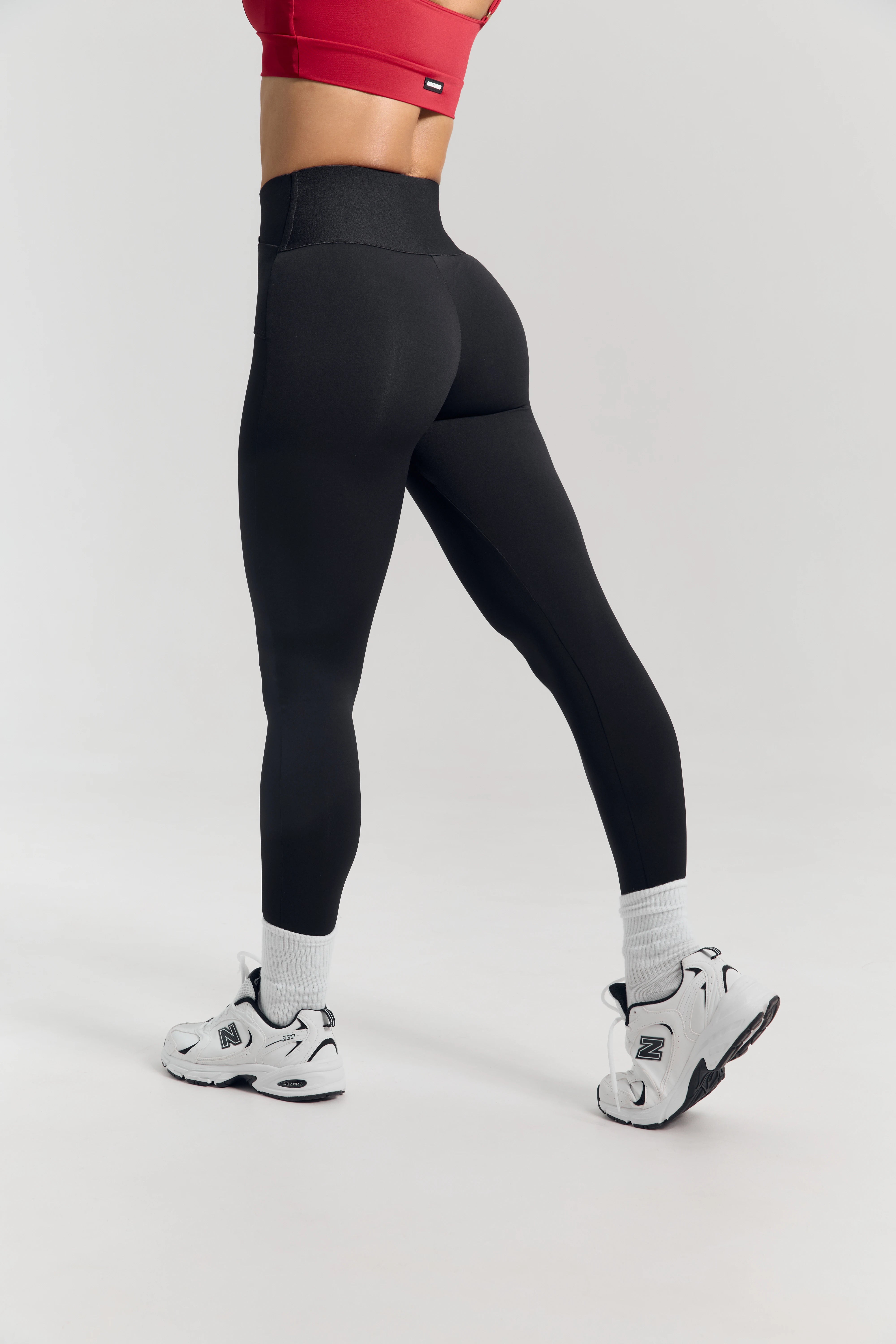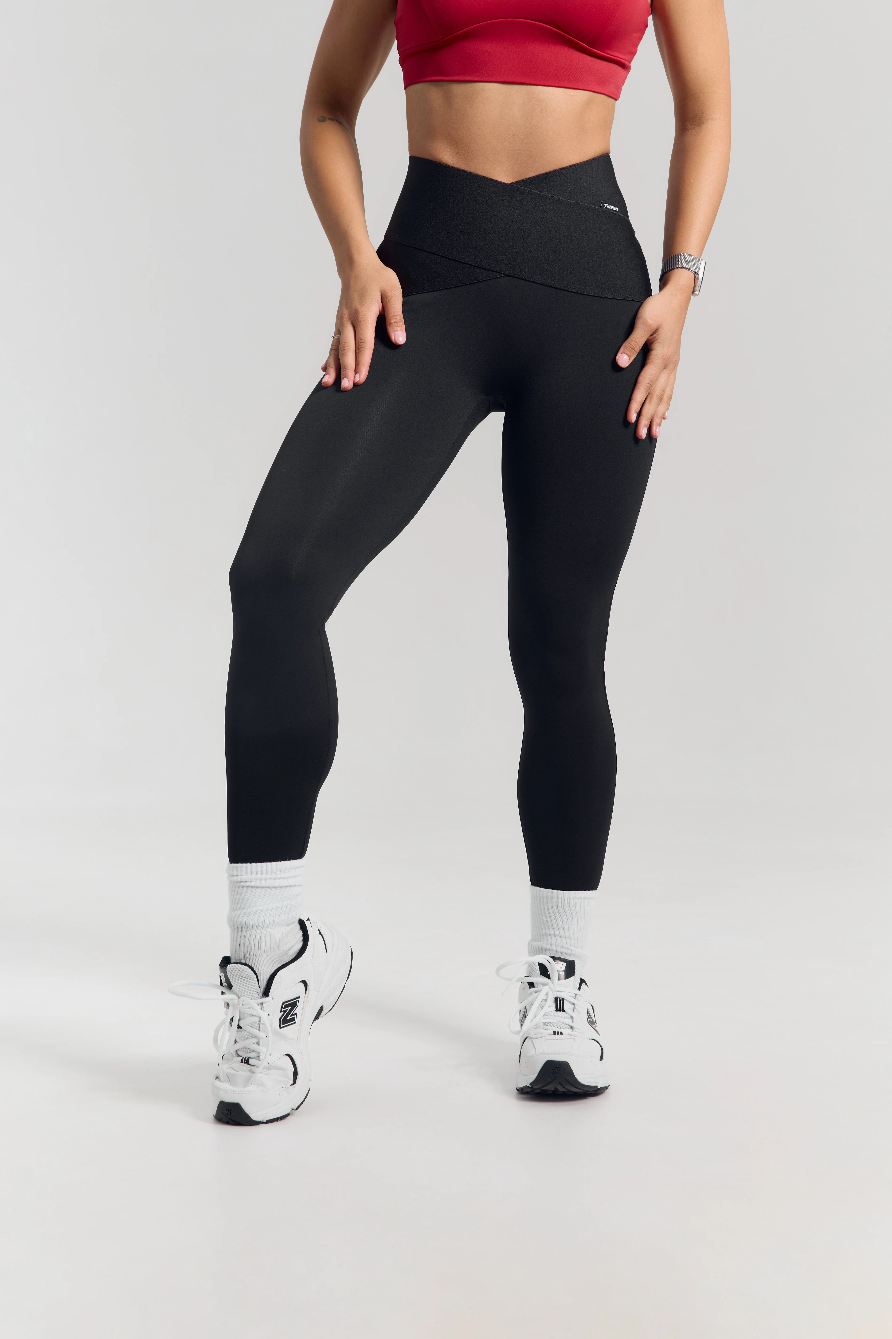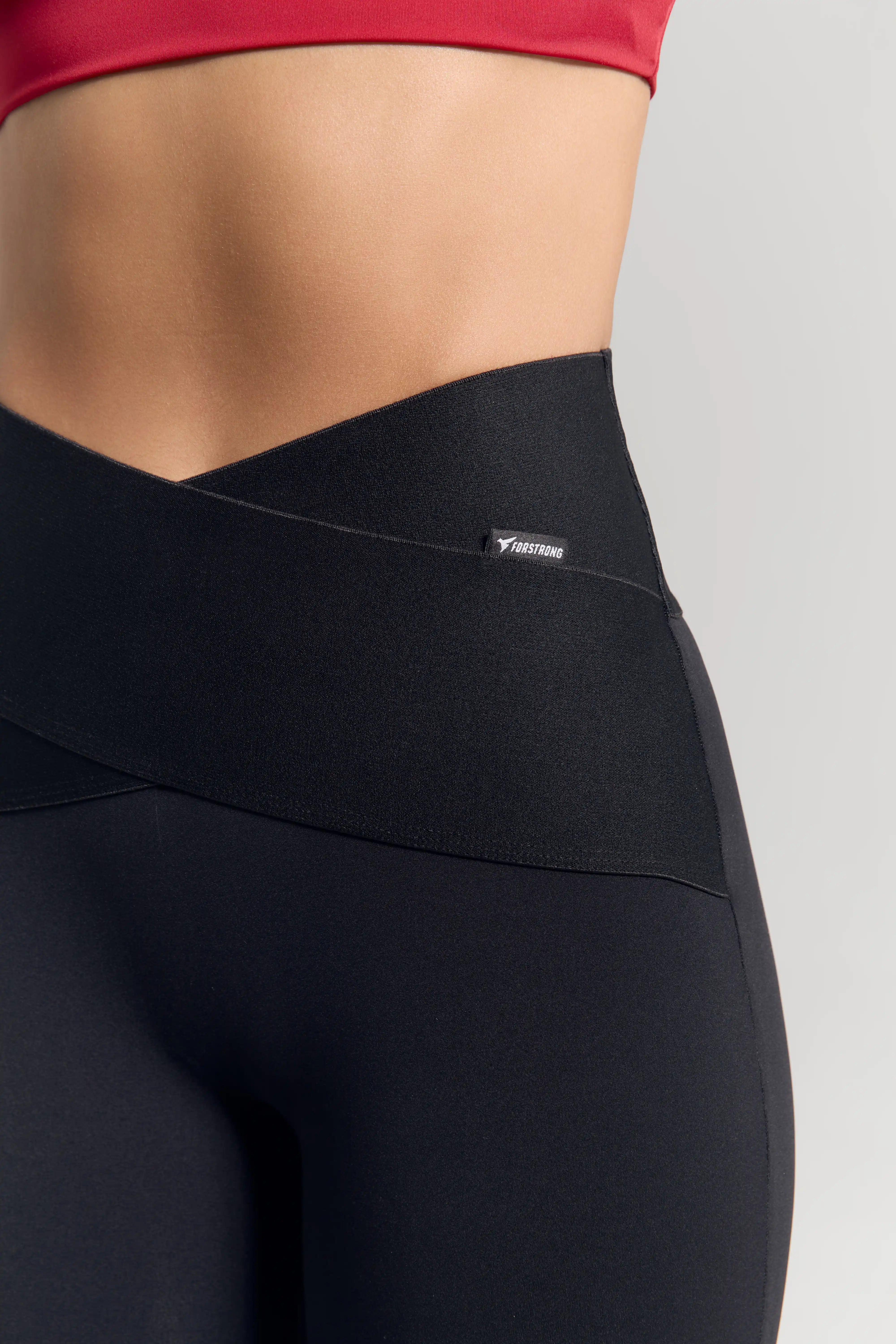 – Basic black high-waisted leggings with a crossover waistband that defines the waist and creates a sleek silhouette.