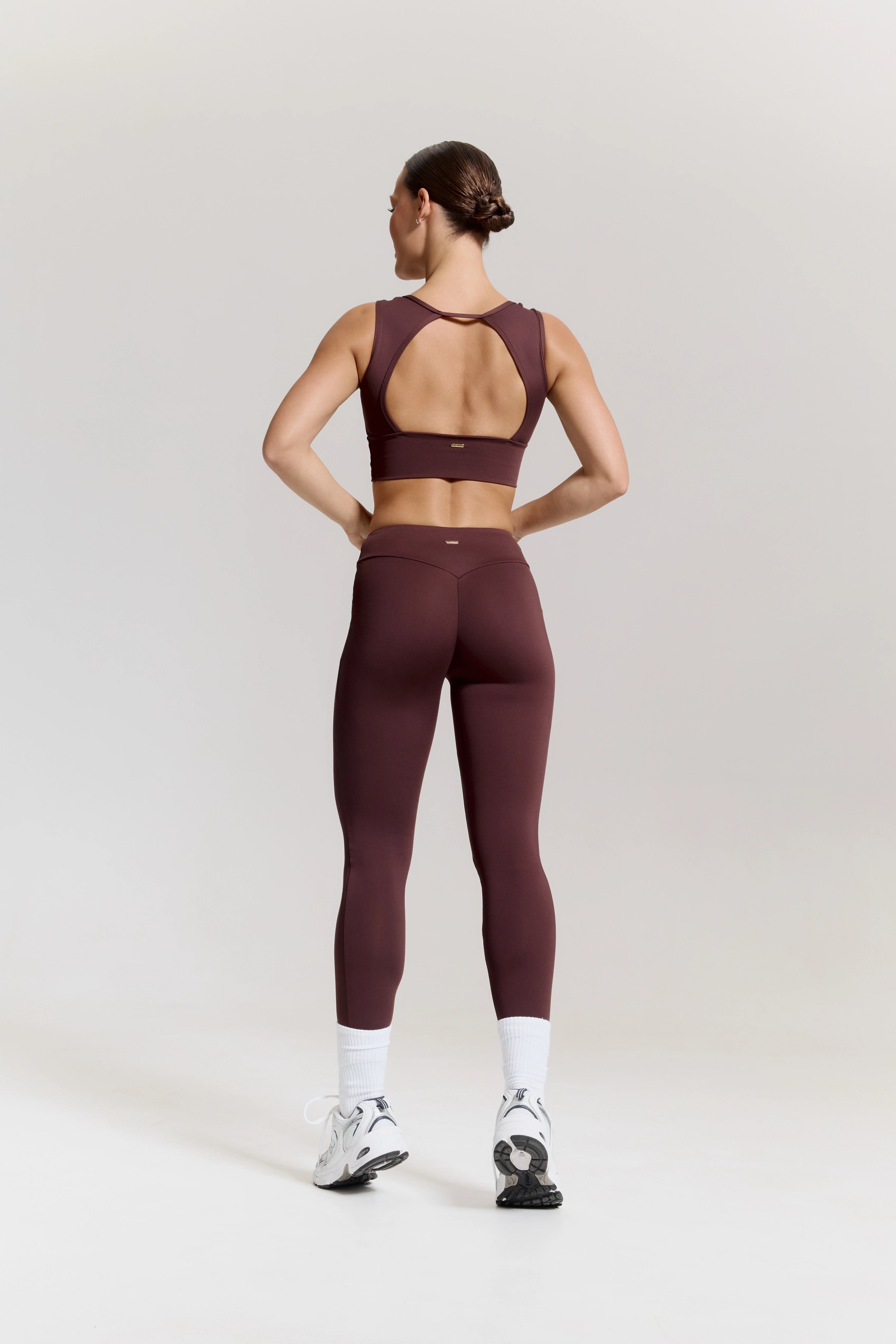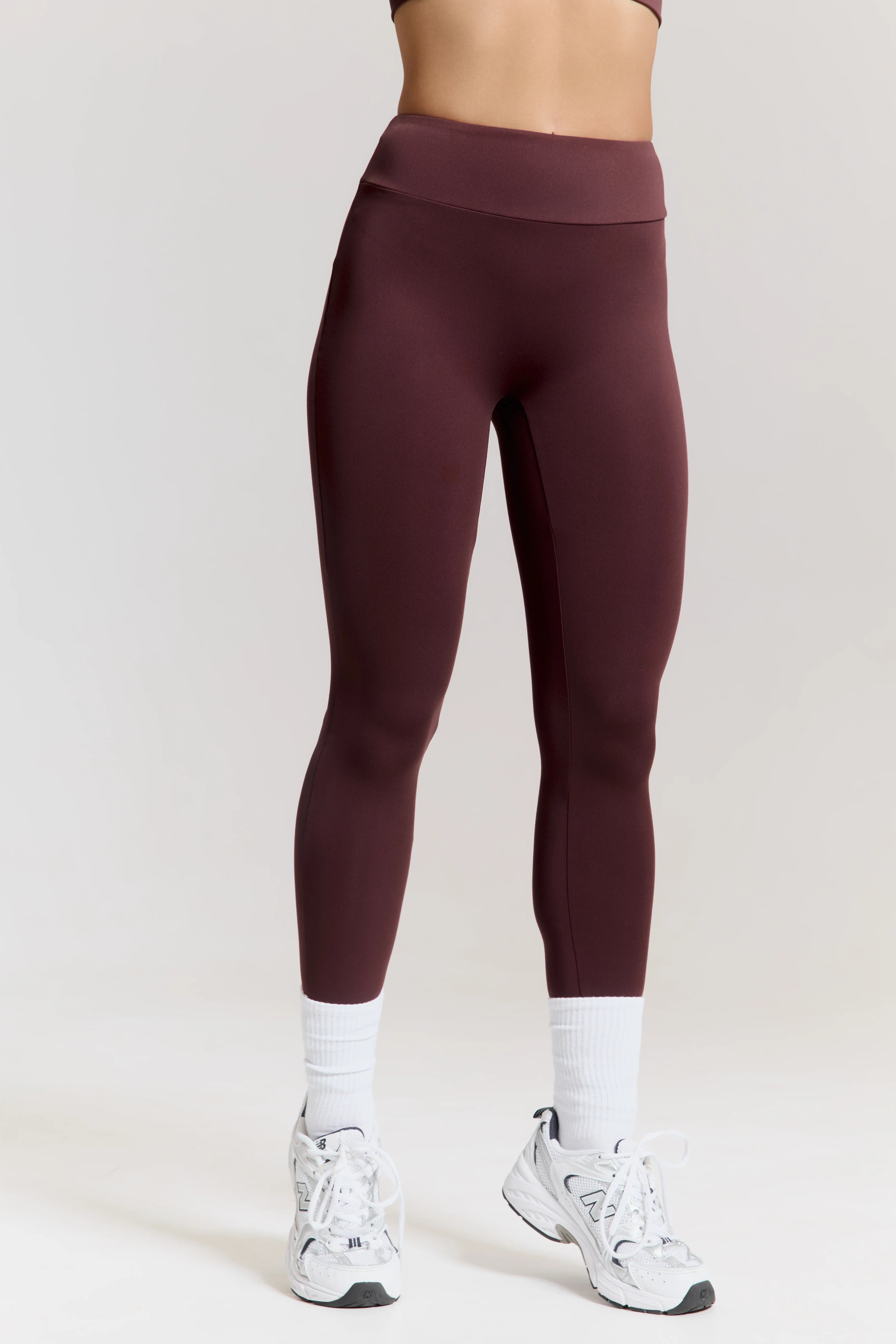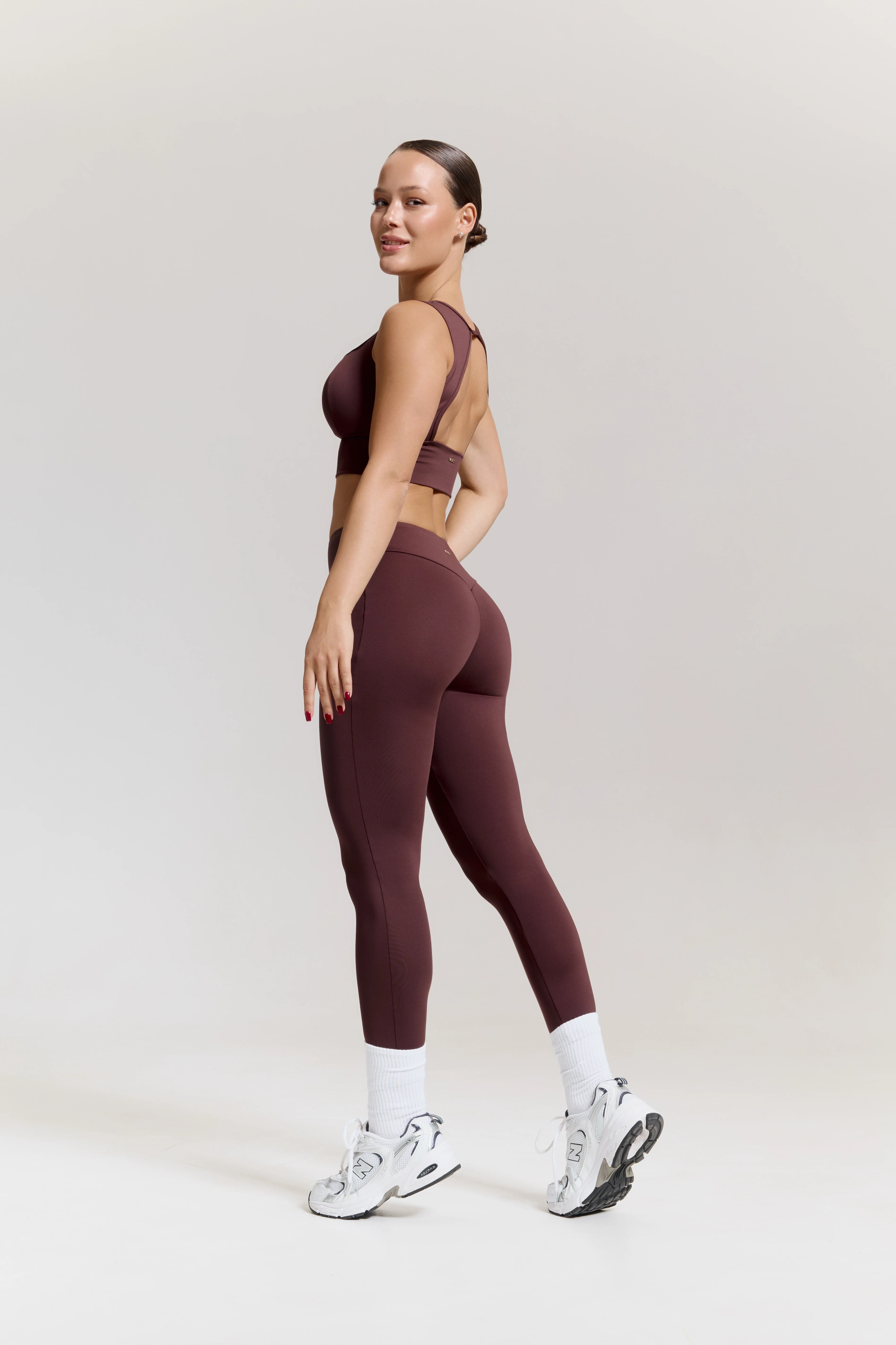 – High-waisted leggings with an anatomical V-shaped waistband that defines the waist and visually elongates the silhouette.
