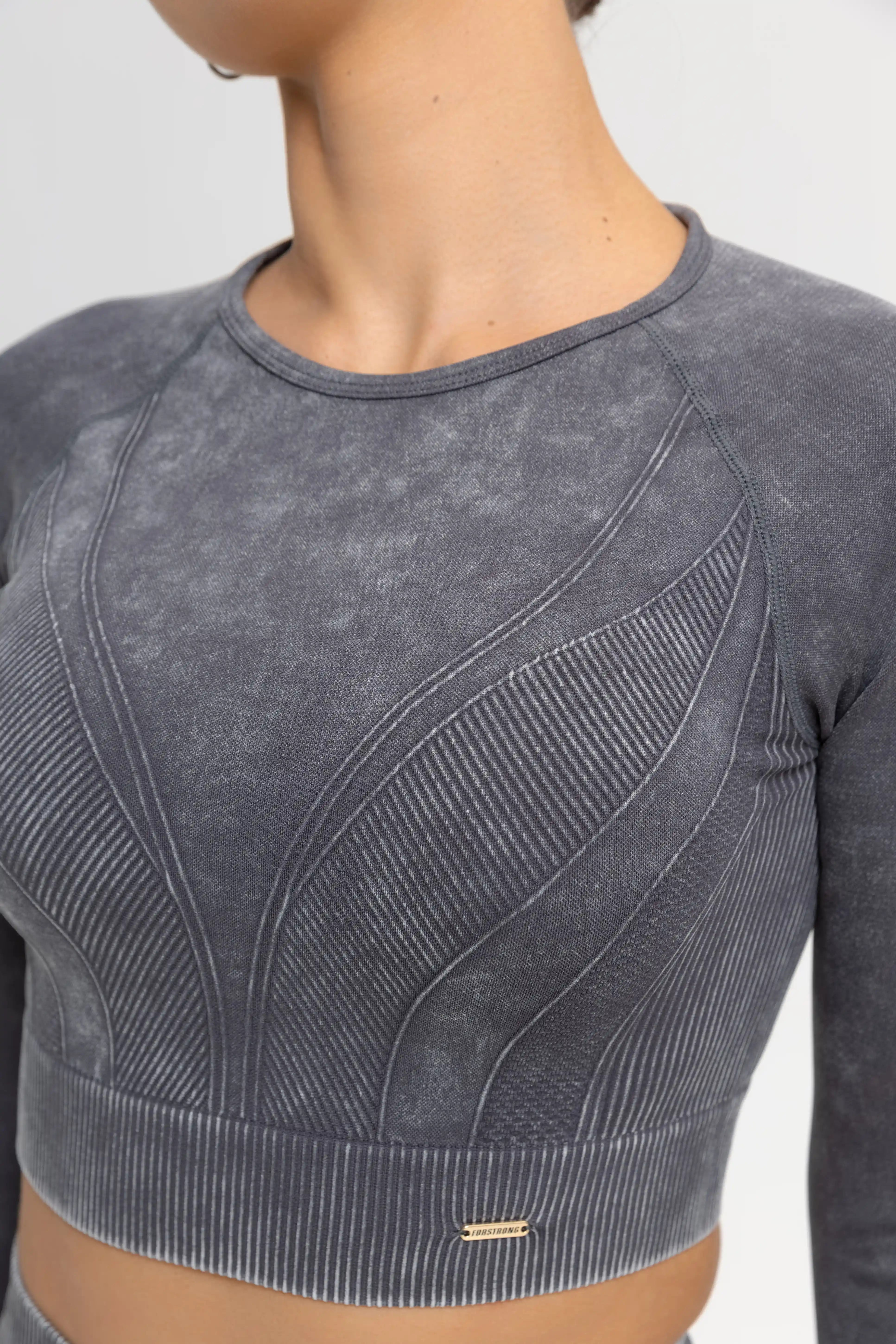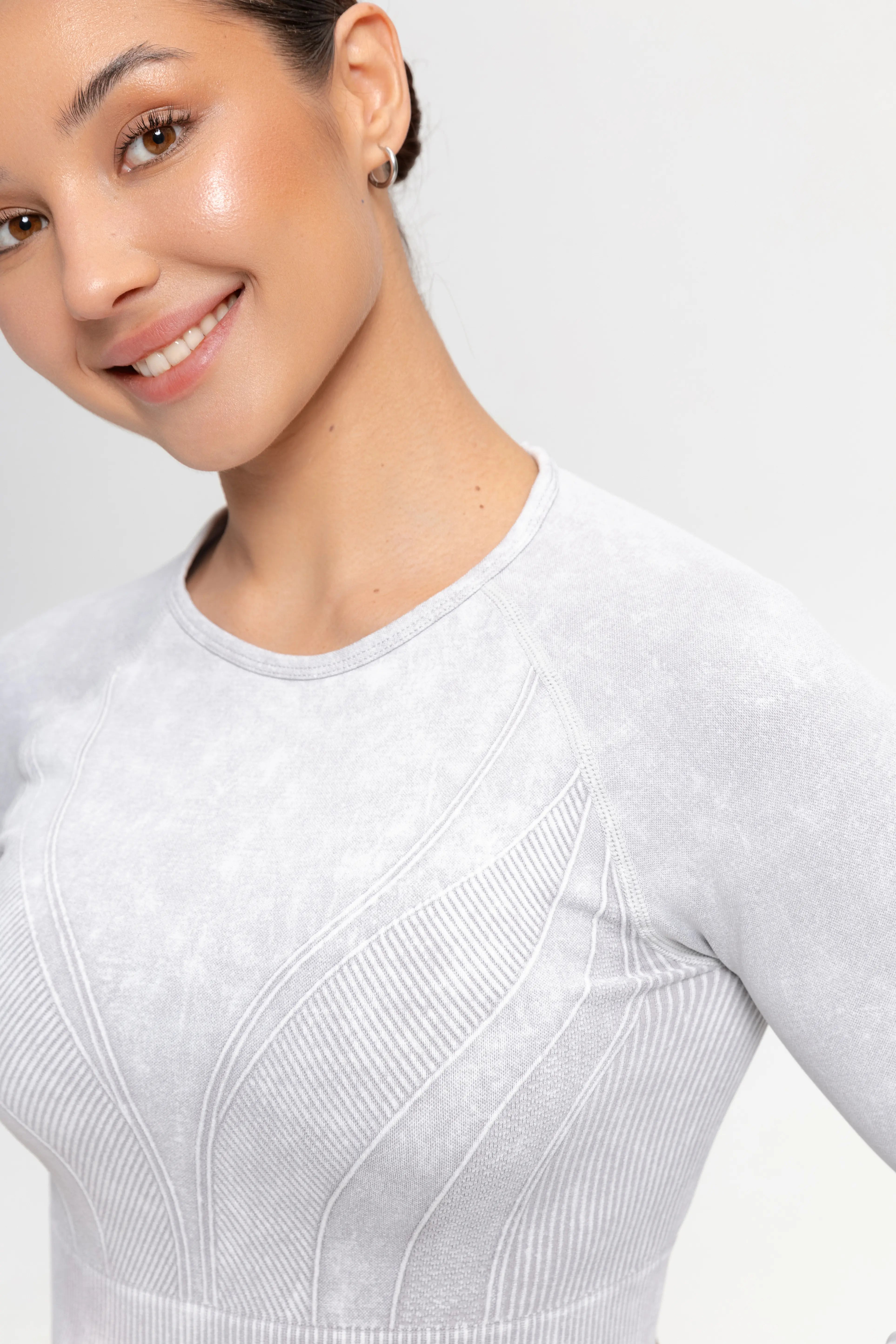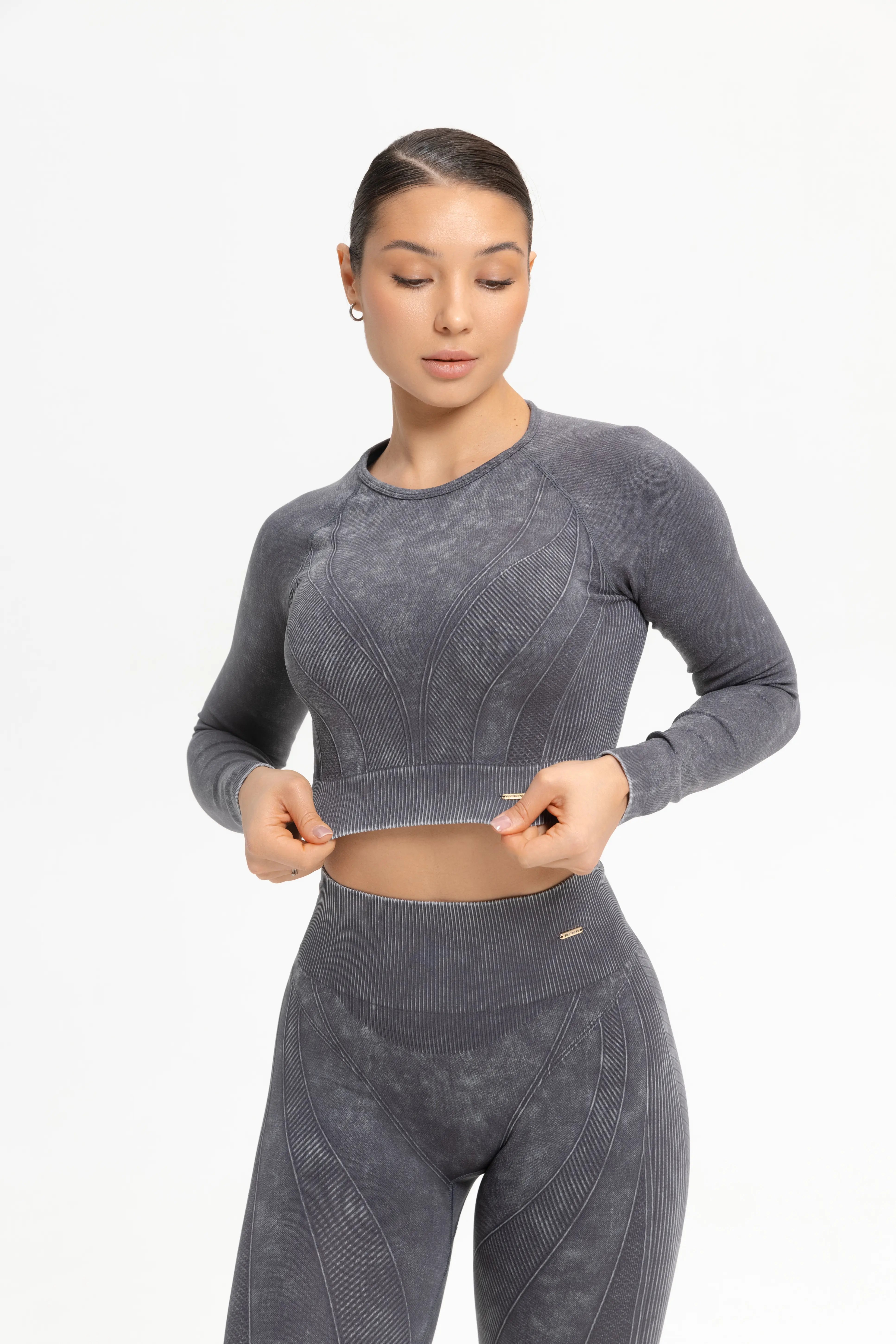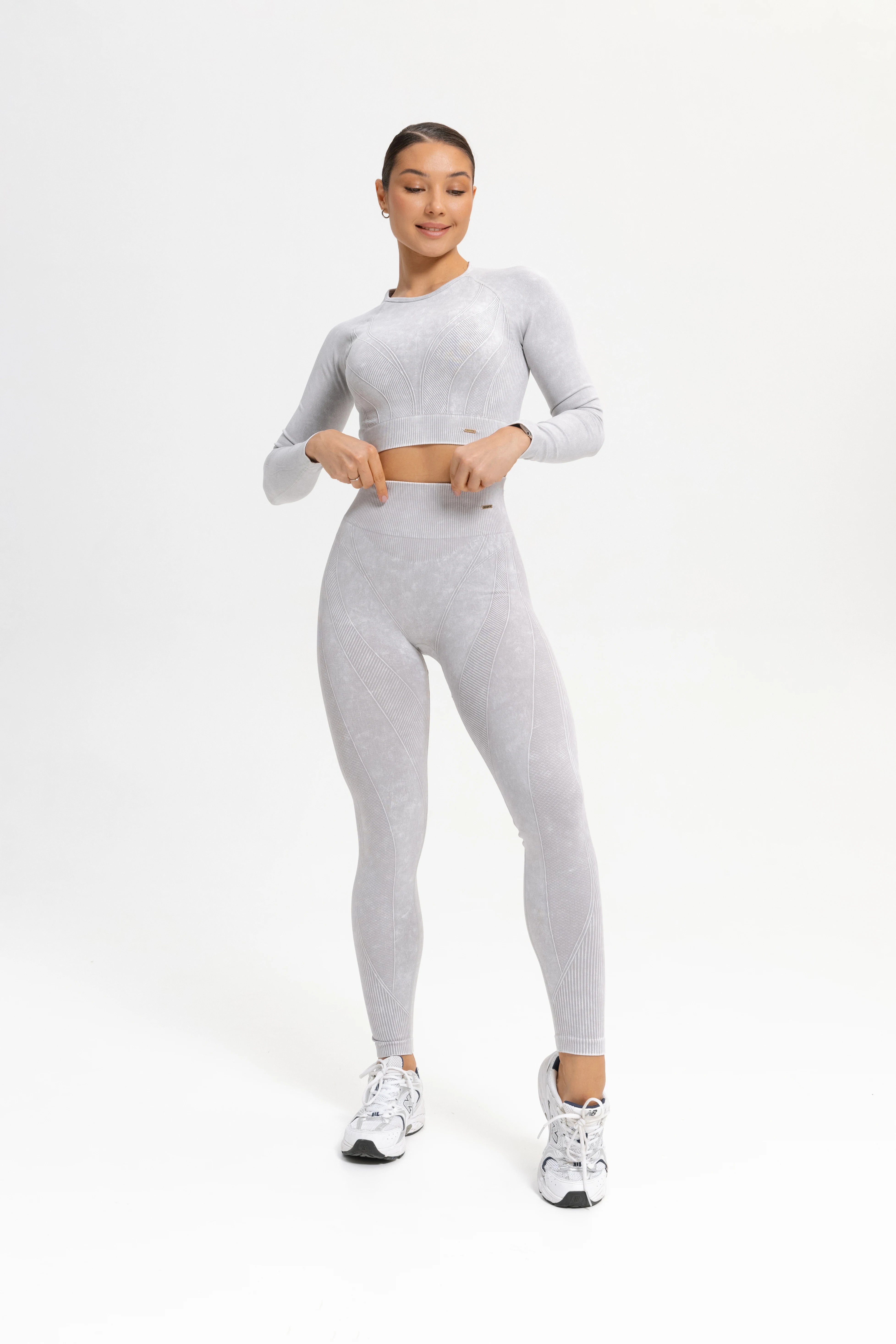 - Dense, stretchy fabric softly hugs the body, creating a light compression effect and supporting the muscles.