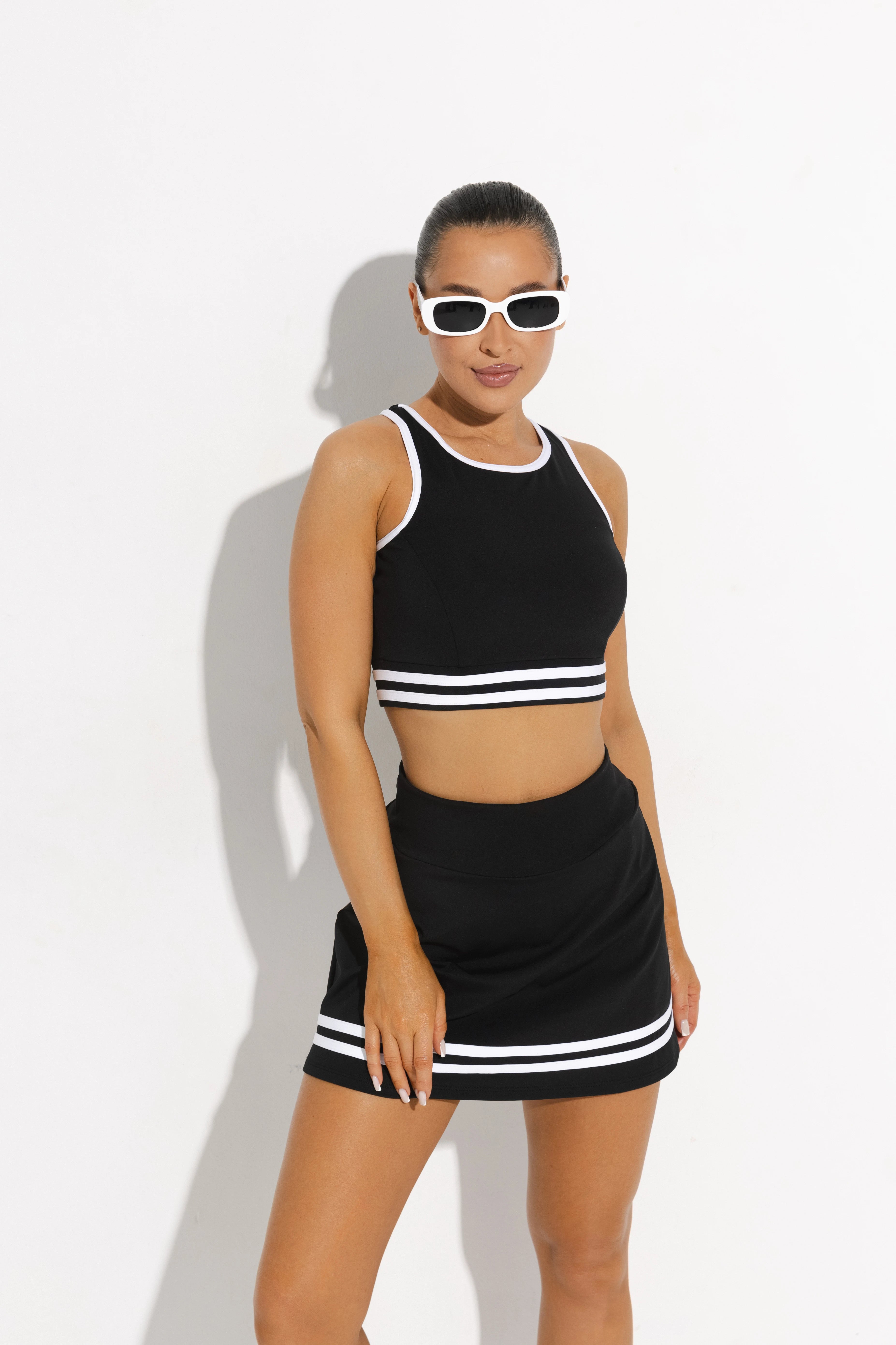 – The outer layer is a lightweight A-line skirt with contrast stripes at the hem, adding a sporty accent and visually elongating the silhouette.